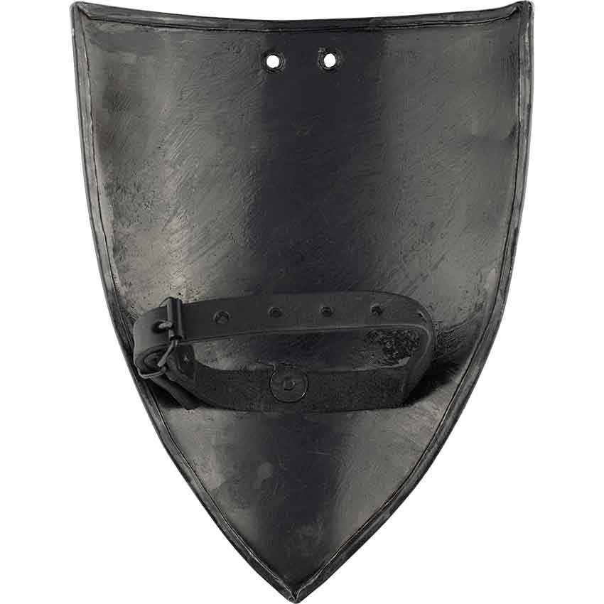 The large "Wilhelm" arm shield is designed to be an upgrade for chainmail shirts. Meant to be worn just below the shoulder, this add-on can show the group’s colours, insignia or heraldry. It attaches to the upper arm with a strap and can be fastened to the chainmail rings by using a leather string. Made of steel, it is not only an additional piece of plate armor but also another nice detail on an existing costume. This piece can also be fastened to any other existing armor or clothing so there is no absolute need for a chainmail. A gambeson is also a good foundation: just sew a leather string to the sleeve and attach the shield there!